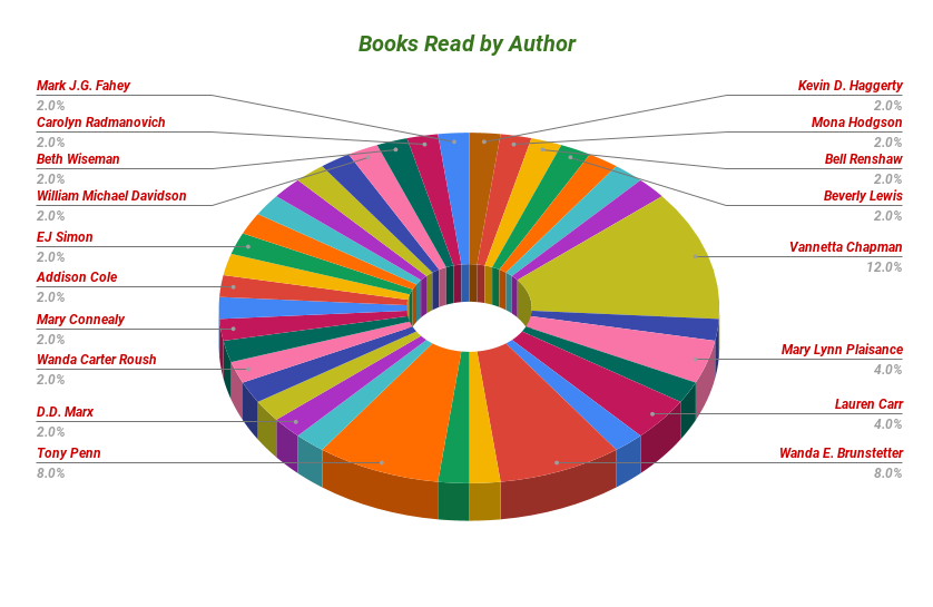 For my Genre of book i enjoyed this year seem to be "Christian Fiction" 16 books (32%). This seem about fair given that Vannetta Chapman is my top author with a total of 6 Books read. The next one is "Children" with 8 books (16%), and then "Historical Fiction" with 6 (12%).